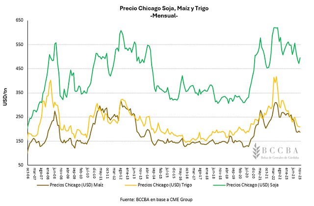 La economía de China viene desacelerando su crecimiento, organismos internacionales como el FMI estiman que la misma crezca un 5,4 % en 2023, lo que reflejaría una fuerte recuperación posterior a la pandemia, pero estiman que el mismo se desacelere en 2024 a niveles del 4,6% siendo uno de los principales drivers la debilidad del mercado inmobiliario. Fundamento bajista en los precios de los commodities agrícolas en vistas de que China es uno de los principales demandantes. Sin embargo, la actividad económica del país asiático repuntó en octubre, aumentando su producción industrial a un ritmo mayor al esperado y creciendo en sus ventas minoristas. Agregando que en las últimas semanas la moneda China (Yuan) viene apreciándose respecto al dólar, lo que significa que gana poder de compra en términos reales sobre los bienes expresados en moneda norteamericana. Se vuelve una señal alentadora, al menos, en el corto plazo ya que podría impulsar la demanda por parte de China y tener su correlato en los precios brindándoles un soporte.