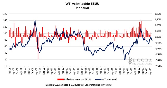 La inflación interanual de octubre en Estados Unidos alcanzó el 3,2%, desacelerándose respecto los meses de agosto y septiembre (cuyo nivel fue del 3,7%). La inflación mensual en dicho mes fue del 0% y, adicionalmente, se registró una caída en la tasa de empleo. El precio del petróleo exhibe un comportamiento bajista, técnicamente se encuentra testeando una resistencia importante. Se produjo un aumento en los inventarios petroleros de Estados Unidos (el mayor productor a nivel mundial) y dicho país mantuvo su producción en niveles elevados.