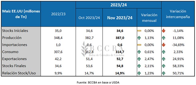 En Estados Unidos la cosecha prácticamente ha finalizado, y según el Departamento de Agricultura de los Estados Unidos (USDA), en su última publicación del informe mundial de estimaciones de oferta y demanda (WASDE por sus siglas en inglés) correspondiente al mes de noviembre, la hoja de balance para el país norteamericano se caracteriza de la siguiente manera: