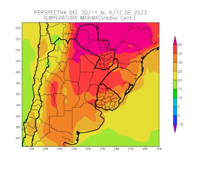 Al comienzo de la primera etapa de la perspectiva continuará la entrada de vientos del trópico, con máximas muy superiores a lo normal sobre el norte del área agrícola, registros elevados, pero no extremos sobre el centro, registros normales sobre gran parte del oeste y el sur, y marcas inferiores a lo normal sobre la costa atlántica, que recibirá vientos marinos.