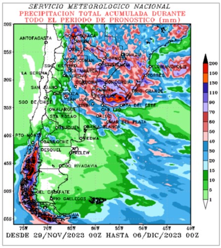 El mapa muestra los potenciales acumulados pluviales que pueden darse en esta próxima semana. Parte de estas lluvias ya se están concretando, pero se espera que entre mañana y pasado, gran parte del centro norte del país siga recibiendo precipitaciones. El epicentro de los máximos pluviales quedaría corrido hacia la provincia de ER y Uruguay, pero sin dejar que se observen lluvias en gran parte del resto de la región pampeana y el norte del país. Es decir, la transición hacia el mes de diciembre, marca una continuidad de eventos que comienza a definir un patrón más húmedo, en principio de mejor despliegue de lluvias. Por sectores, este patrón ya está corrido definitivamente hacia la sobreabundancia pluvial. Esto vale principalmente para el norte de la Mesopotamia, pero las señales donde aparecen totales mensuales con registros muy sobrados respecto de la estadística, ya comienzan a dejar de ser una excepción.