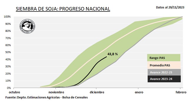 Al momento se han sembrado 2,3 MHa de las 7,1 MHa estimadas que significan un adelanto interanual de 7,3 puntos porcentuales pero un retraso de 3,9 p.p. respecto a las últimas cinco campañas