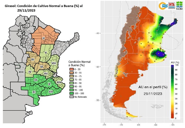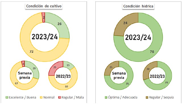 En simultaneo, avanza a buen ritmo la siembra del maíz con destino grano comercial sobre el centro y sur del área agrícola. Los colaboradores informaron un progreso intersemanal de 6,1 p.p., cubriendo el 32,3 % de las 7,1 MHa proyectadas para la presente campaña. Lluvias registradas en los últimos días demoran las labores, pero seguramente mejoren la condición de los lotes en pie, fundamentalmente de los que inician estadios reproductivos. Respecto al girasol, la siembra registró un progreso intersemanal de 2,8 p.p., cubriendo el 97,2 % del área proyectada para el ciclo 2023/24, registrando un adelanto interanual de 3,8 p.p. Si bien, las siembras tempranas del norte del área agrícola manifiestan signos de las limitantes hídricas que sufrieron durante el inicio del desarrollo, la actual frecuencia de las lluvias acompaña el desarrollo de los lotes sembrados por fuera de la ventana óptima de siembra y mantiene la condición de cultivo entre Normal y Buena en el 91,1 % del área en pie.