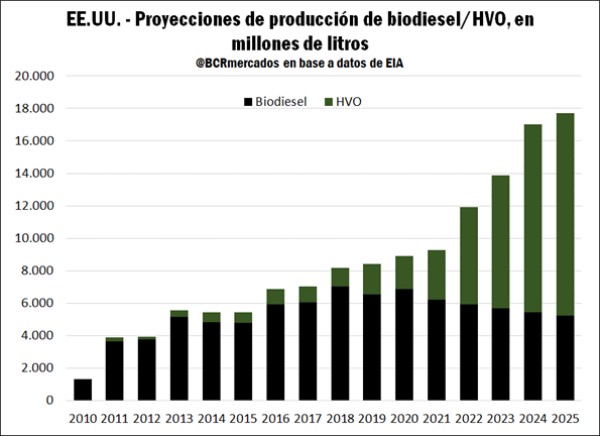 Estados Unidos se encuentra en un proceso de gran crecimiento en la producción de biocombustibles, para cumplimentar los mandatos de la Agencia de Protección Ambiental de Estados Unidos (EPA). En este marco, se destaca el gran impulso en la producción de Aceite Vegetal Hidrotratado (HVO, por sus siglas en inglés) que es un diésel renovable. Se están realizando importantes adaptaciones de grandes refinerías de petróleo para convertirlas en plantas de elaboración de HVO con aceite de soja y nuevas plantas que se están proyectando para los próximos años.