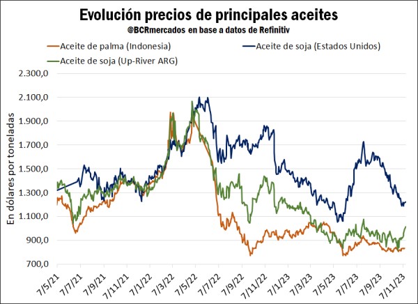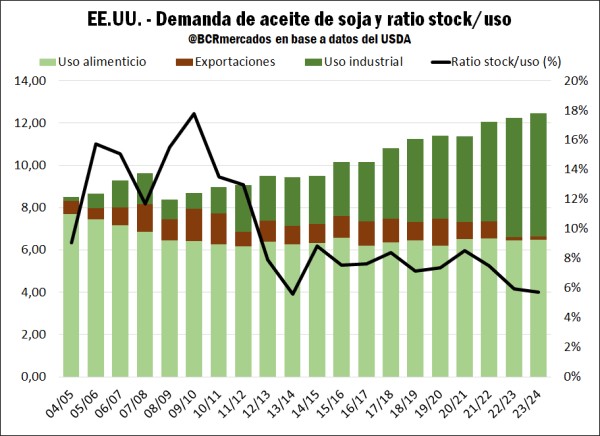 Estados Unidos abastece su industria de biodiesel principalmente con su producción local de aceite de soja sumado la oferta local de otros derivados y las importaciones de aceites. Desde mayo de 2022, los precios FOB del aceite de soja en Estados Unidos se desacoplaron de Argentina y Brasil, dos jugadores clave en el mercado exportador de este producto. Previo al inicio de la campaña 2023/24 de soja en Estados Unidos el mes de septiembre de 2023, los precios FOB del aceite se dispararon debido a los escasos stocks de soja en Estados Unidos para procesar en conjunción con una alta demanda doméstica que llevó los stocks de aceite a niveles muy bajos. Tras el inicio de la campaña, el nivel de oferta de soja se normalizó y los precios comenzaron a bajar. A ello se le agrega importaciones muy altas los últimos meses de aceites vegetales, entre ellos, aceite de cocina usado y de colza.