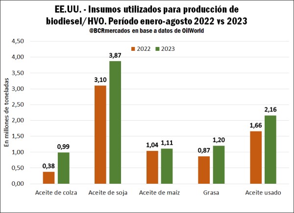 Ahora bien, al analizar los insumos utilizados para la producción de biodiesel - incluyendo HVO - entre enero y agosto de 2023, el aceite de soja es el principal producto utilizado con una participación del 41% en lo que va de 2023 y estable respecto al 44% de 2022 para igual período. En términos relativos, el producto que más creció como insumo para la producción de biodiesel es el aceite de colza pasando de 0,38 Mt en 2022 hasta 1 Mt en 2023. Su participación relativa como insumo para la industria de biocombustibles se duplicó pasando del 5% en 2022 hasta 11% en 2023 para los meses bajo análisis. Al mismo tiempo, sigue creciendo la utilización del aceite usado para la producción de biodiesel/HVO, siendo el segundo insumo más utilizado con 2,16 Mt entre enero y agosto de 2023, un incremento interanual de 30%. En general, crece el uso de todos los aceites, pero el dato clave es que no alcanza con el incremento de la producción de aceite de soja a nivel doméstico para abastecer el ritmo de crecimiento en la producción de biodiesel/HVO en Estados Unidos.