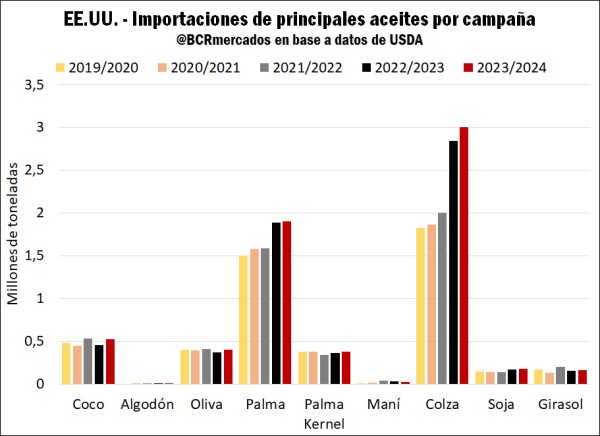 En la campaña 2022/23 creció de forma exponencial las importaciones de aceite de palma y colza, con expectativas de continuidad en el crecimiento de las compras en la nueva campaña 2023/24. Entre los principales aceites, el derivado de la colza es el que acapara mayor volumen de importaciones con 2,84 Mt en 2022/23 y una proyección de 3 Mt para el año comercial 2023/24 que comenzó en octubre. De cumplirse dicho total, el incremento en las importaciones de aceite de colza de Estados Unidos alcanzarían el 50% respecto a la campaña 2020/21. Para el caso del aceite de palma, se proyectan importaciones por 1,9 Mt en la campaña 2023/24, un aumento del 20% respecto al ciclo 2020/21, previo al salto discreto en las importaciones.