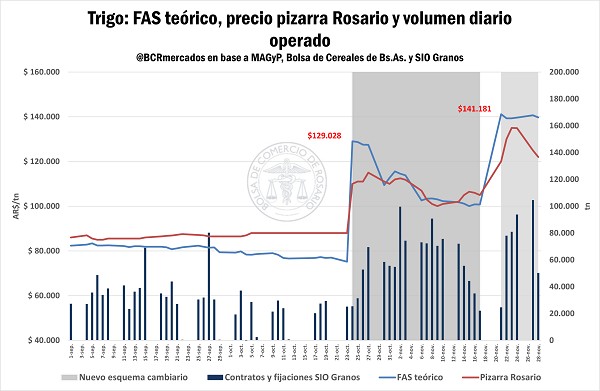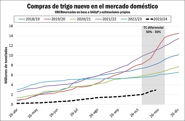 Desde la entrada en vigor de la nueva reglamentación cambiaria el pasado mes de octubre, al momento de escribir este informativo, se han comercializado 1,76 Mt de trigo. De la nueva campaña, teniendo en cuenta los últimos datos disponibles, se habrían comprometido hasta ahora casi 3 Mt del cereal, de las cuales, el 45% se operaron entre los meses de octubre y noviembre.