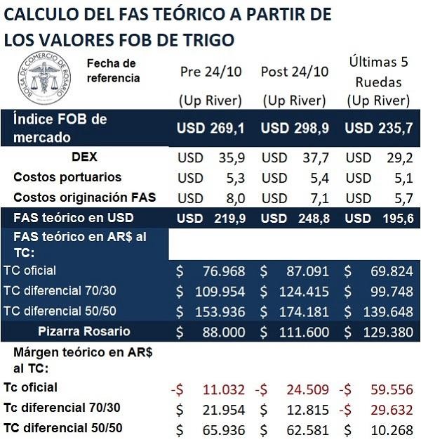A la fecha, siguiendo los datos que expone el cuadro a continuación, el diferencial cambiario permite mantener a flote el margen bruto para la exportación de trigo (aunque muy por debajo de los valores que ostentaba hasta hace menos de un mes), en tanto que de discontinuarse el esquema y liquidar a un tipo de cambio oficial la capacidad de pago de la exportación se derrumbaría a terreno negativo, pasando de los actuales +10.268/t promedio de las últimas cinco ruedas a -59.556/t.