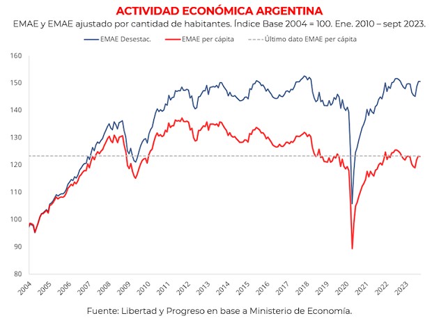 En septiembre de 2023, último dato disponible, el EMAE se ubicó apenas 2,7% por encima del promedio de 2011. Señal de un estancamiento que perdura desde hace más de una década. Mientras tanto, la población argentina creció un 13,1%, lo que nos ha llevado a una persistente declinación del ingreso por habitante. Con estimaciones oficiales hasta septiembre, el ingreso por habitante se encuentra en los niveles de abril del año 2007.