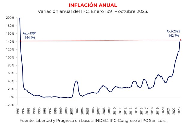 En los 12 años que van de estanflación, la inflación se aceleró del 22,8% anual en 2011 al 142,7% registrado en octubre de 2023. Es decir, una suba de 119,9 puntos. En todo ese lapso, la inflación anual más baja registrada en Argentina fue del 21,4%, en julio de 2017, es decir claramente en la zona de dos dígitos.