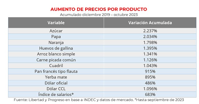 Para peor, los salarios no acompañaron la suba de los precios y quedaron marcadamente por debajo de la inflación. Teniendo en cuenta el Índice de Salarios del INDEC, desde diciembre de 2019 hasta septiembre del 2023 (último dato disponible), acumularon una suba de 683%. Con lo cual, la pérdida de poder de compra ha sido significativo. Por ejemplo, el azúcar aumentó 2.237%, los huevos un 1.395%, el arroz 1.341%, la carne de cuadril 1.043% y la yerba 895%, según el propio relevamiento del INDEC.
