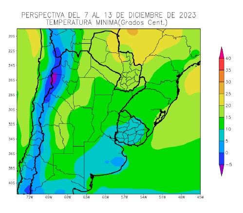Al comienzo de la primera etapa de la perspectiva, continuará la entrada de aire polar, iniciada en los primeros días de Diciembre, provocando temperaturas mínimas por debajo de lo normal en la mayor parte del área agrícola, con riesgo de heladas localizadas sobre el Sudeste Bonaerense.