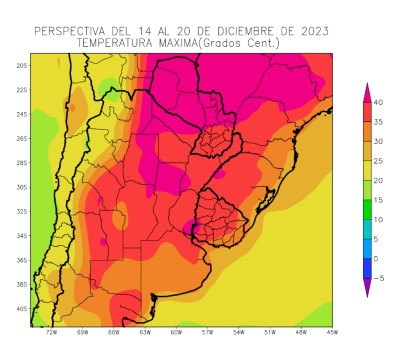 • El este del NOA, la mayor parte de Cuyo, el sur de la Región del Chaco, el sudeste del Paraguay, gran parte de la Mesopotamia, el norte y el oeste de la Región Pampeana y gran parte del Uruguay observarán temperaturas máximas superiores a 35°C con varios focos con valores superiores a 40°C, y otros focos con valores inferiores.