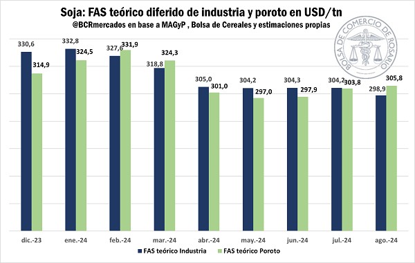 Mientras tanto, el poder teórico de compra por parte de la exportación oscila en torno a los 330 USD/tn para las posiciones más inmediatas según estimaciones propias, aunque las posibilidades de capturar estos valores están muy limitadas por la escasa oferta disponible. A partir del ingreso de la nueva cosecha, se prevé una presión sobre este guarismo cayendo por debajo de 300 dólares por tonelada para mayo 2024.
