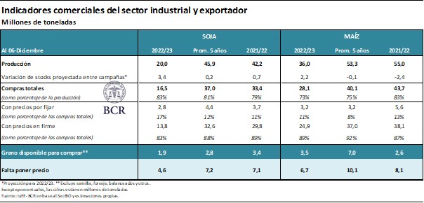 En el caso del maíz, diciembre comienza con una disponibilidad de grano para comprar por parte de la industria y la exportación (ello es, sin contar asignaciones para semilla, forraje y otros) por 3,5 Mt, por encima del año pasado, aunque es casi la mitad del promedio del último lustro. Además, hay 6,7 Mt de maíz sin precio firme.