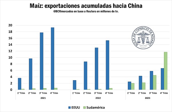 La disponibilidad del cereal y su bajo precio le ha valido a nuestro país vecino para reclamar una mayor parte del mercado japonés, tradicionalmente abastecido por el maíz norteamericano de forma indiscutida. Inclusive otro país asiático también habría sido abordado por las exportaciones brasileras, y es que, según las propias estadísticas locales, durante el 2023 Brasil habría exportado 11 Mt hacia China, inclusive más que Estados Unidos.