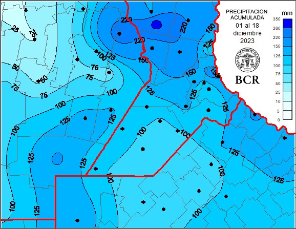 Con los 30 a 90 mm que sumó en el último fin de semana la región, ya se acumularon 116 mm en lo va del mes tomando el valor promedio de las 36 estaciones de GEA/BCR. La media de todo diciembre está justamente entre los 100 a 125 mm. Pero hay localidades con acumulados por encima de los 200 mm y otras con menos de 50 mm. La máxima marca es la de Noetinger con 273 mm. Le sigue Irigoyen con 216 mm y Clason con 209 mm. Pero el máximo valor de la región sería el de El Trébol, donde los locales han medido 313 mm. Sin dudas el Niño fuerte está mostrando los dientes con registros que llegan casi a triplicar la media mensual y empieza a haber preocupación por el riesgo de inundaciones en la región.
