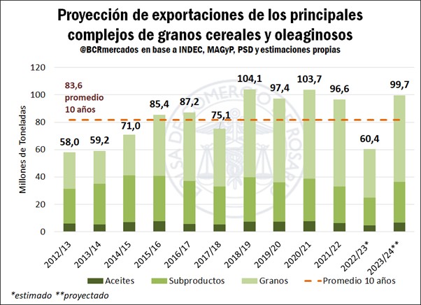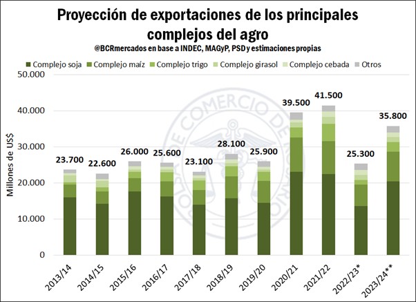 De esta manera, la exportación de granos y subproductos del agro representaría cerca del 45% del total de los US$ 75.000 millones proyectados a exportar en total desde el país para el próximo año 2024.