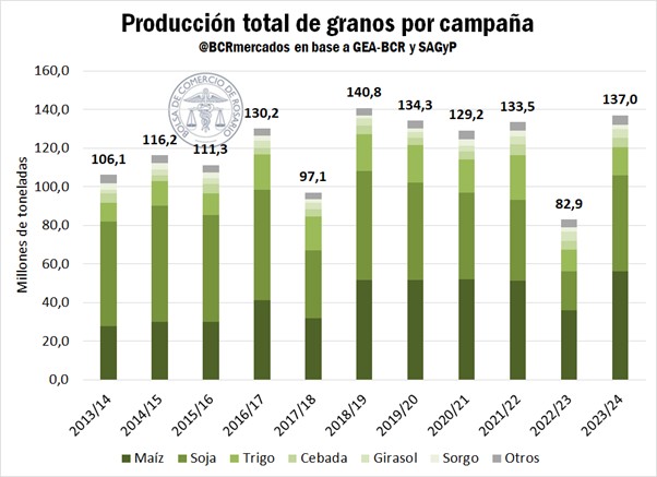 De esta manera, la producción total de granos en la 2023/24 podría alcanzar 137 Mt, un 65% más que el volumen total obtenido en la campaña previa. De confirmarse esta cifra quedaría como la de segunda mayor producción de la historia, sólo por detrás de los 140 Mt del ciclo 2018/19.