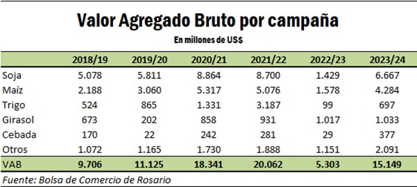 Finalmente, la recuperación de la producción no sólo tiene su impacto en el frente externo generando divisas genuinas para el país, sino que también impacta en la economía nacional: el Valor Agregado Bruto de la producción de granos en la nueva campaña se triplica respecto del valor del ciclo 2022/23, alcanzando más de US$ 15.000 millones.
