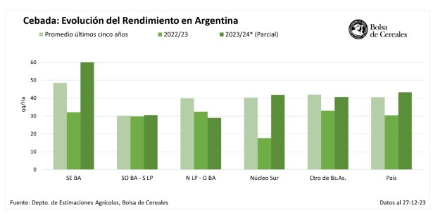 Finalmente, con un progreso interquincenal de 30,2 p.p., la cosecha de cebada cubre el 70 % del área apta. El rinde medio se ubica en 43,2 qq/Ha. Con el avance sobre Buenos Aires y La Pampa, se relevaron rindes por encima de nuestra previa estimación, escalando la proyección de producción a 5 MTn. Sobre los núcleos cebaderos del sur de Bs.As. se están evaluando los daños tras la caída de granizo. Sin embargo, cabe mencionar que los rindes obtenidos al momento sobre el Sudeste de Buenos Aires son los que sostienen nuestra proyección de producción.