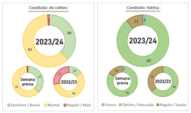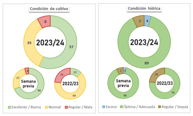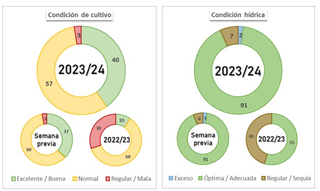 Luego del temporal, el 88,5 % del área mantiene una condición hídrica Adecuada a Óptima. Y el 92,1 % mantiene una condición de cultivo Normal a Excelente. El 40,7 % transita desde Botón Floral en adelante.