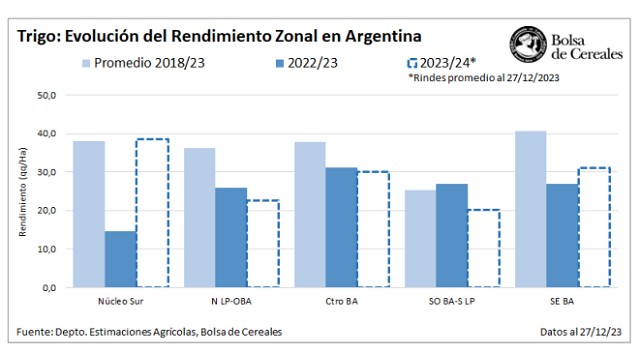 Respecto a trigo, la cosecha ya cubre el 70,9 % del área apta, tras un progreso intersemanal de 5,7 p.p. Luego de los temporales de la última semana, se ralentizan las labores y se estima que puede haber mermas y problemas de brotado, aunque aún no se han evaluado la magnitud de estos daños. Por esta razón, se mantiene la proyección de producción en 14,7 MTn.