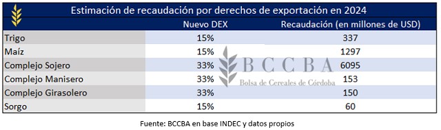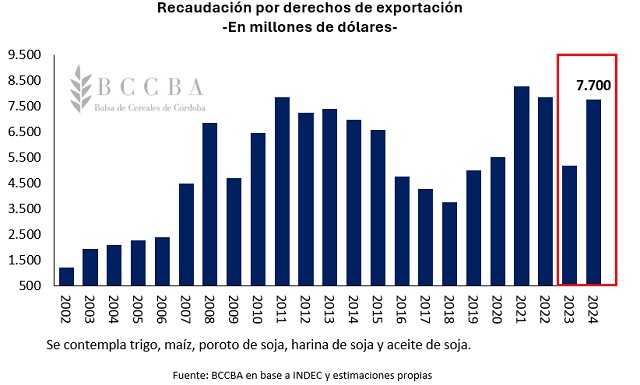 Los principales productos de exportación del complejo agroindustrial (trigo, maíz, soja, aceite de soja y harina de soja) durante el 2024 aportarían alrededor de USD 7.700 millones en términos de derechos de exportación, considerando el posible reajuste en las alícuotas planteadas en el proyecto de Ley enviado al Congreso Nacional. Dicho valor representa un incremento de casi el 50% respecto al 2023, aportando más USD 2.500 millones adicionales. La suba obedece, en parte, a la recuperación en la producción luego de una de las peores sequías en la historia.
