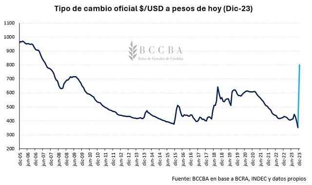 El sinceramiento del tipo de cambio oficial, pasando de $360 a $800 pesos por dólar acompañado por un crawling peg del 2% mensual, permitió pasar de un tipo de cambio muy atrasado, en términos reales, a uno mucho más competitivo.