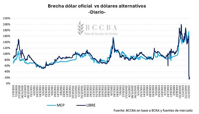 En conjunto, la devaluación y el compromiso de mejorar las cuentas públicas llevaron las brechas entre el dólar oficial y los dólares alternativos a los niveles más bajos en casi cuatro años, rondando el 20%.
