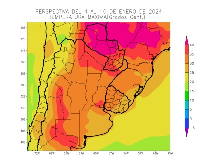 • El este del NOA, el este de Cuyo, la mayor parte de la Región del Chaco, gran parte de la Mesopotamia, el este de Córdoba y el oeste del Uruguay observarán temperaturas máximas superiores a 35°C, con un foco con registros superiores a 40°C, que se ubicará sobre el Paraguay y otros focos con valores inferiores.