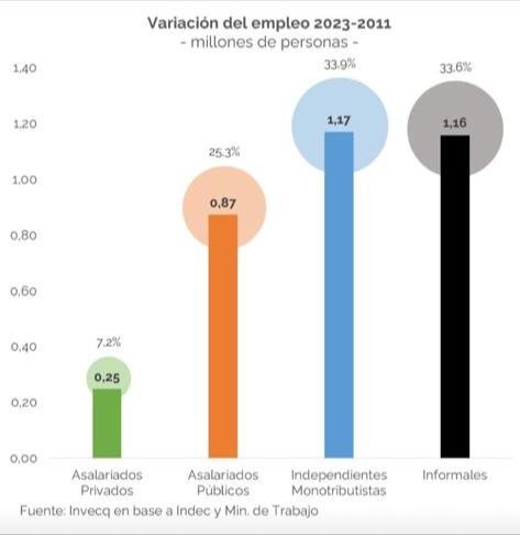 Del otro lado, solo el 7,2% de los nuevos puestos de trabajo se crearon en el sector privado asalariado registrado, que es empleo formal de alta productividad. Son apenas 250.000 empleos en 12 años; para poner en perspectiva, entre el 2003 y el 2008 se habían generado 2,2 millones en 5 esos años.