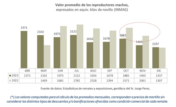 En este contexto, el mercado de reproductores terminó ajustando vía precios. De acuerdo a las estadísticas que surgen de las ventas realizadas en los principales remates y exposiciones del país, los valores pagados por los reproductores machos este año resultaron significativamente inferiores a los de 2022. Medido en kilos equivalentes de novillo, el valor promedio de los reproductores comercializados durante la presente campaña se situó en torno a 1.760 kilos, que, comparado con los 2.500 kilos promedio resultantes de la zafra anterior, marca un retroceso promedio del 30% anual.