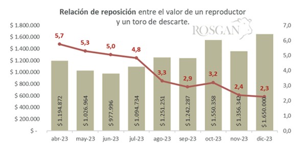 En efecto, una relación incluso más directa se ve reflejada en el valor de reposición de un reproductor medido contra el valor de mercado de un toro de descarte con destino a faena. En los primeros meses de la campaña, el valor de un reproductor - que por aquel entonces fluctuaba entre 1 millón y 1,2 millones de pesos corrientes - equivalía al valor de aproximadamente 5 toros de descarte, considerando un toro de 700kg al valor promedio marcado para la categoría en el MAG. En tanto que, en los últimos dos meses del año esa misma relación de valores, caída a la mitad, es decir, que con menos de 2,5 toros de descarte era posible hasta las últimas semanas reponer un reproductor para ser utilizado - dependiendo del manejo - en al menos 3 a 4 años.