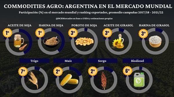 Al mismo tiempo, el agro no solo es importante puertas adentro, sino que la participación relativa en el comercio internacional de Argentina es en algunos casos muy relevante: