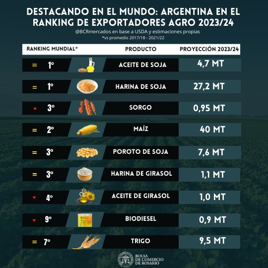 Según las estimaciones del Departamento de Agricultura estadounidense y proyecciones propias de la BCR, en la nueva campaña 2023/24 Argentina mantendría su posición indiscutida sobre el mercado internacional de Aceite y Harina de soja. Al mismo tiempo, las expectativas de una gran cosecha maicera permitirían mantener el segundo puesto en el mercado internacional del cereal frente a las adversidades climáticas que aquejan a Brasil y en trigo se espera mantener el séptimo puesto a nivel mundial. No obstante, en sorgo, aceite de girasol y biodiesel se retrocedería algunas posiciones en el ranking mundial.