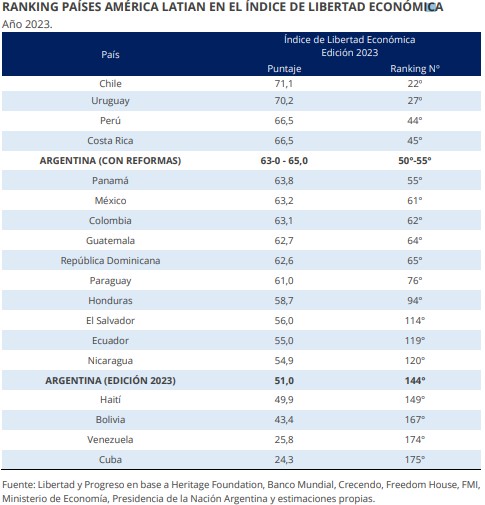 Con la implementación de las reformas, Argentina tendría un índice de libertad económica similar al de España (51°), Rumania (53°) o Francia (57°). Comparando con la región, podría alcanzar, e incluso superar, a México (61°) y Colombia (62°). Aunque quedaría por debajo de Chile (22°), Uruguay (27°), Perú (44°) y Costa Rica (45°).