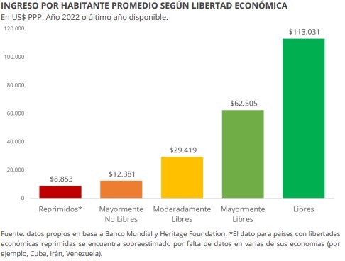 La evidencia empírica indica que los países más libres alcanzan mayores niveles de desarrollo e ingreso por habitante. El promedio de ingreso per cápita para las economías libres es 12,8 veces mayor al de economías con libertades reprimidas.