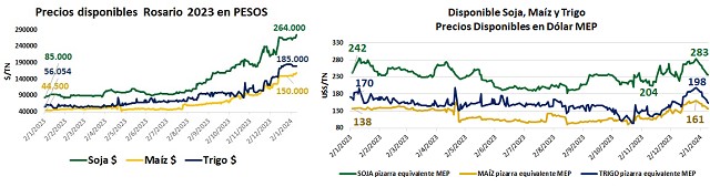 Los precios en PESOS, o en Dólar oficial, tienden a confundir respecto del poder adquisitivo de los granos, y el precio de los granos tienden a confundir respecto al poder adquisitivo de la superficie cultivada y cosechada. Es importante entonces considerar los precios actuales del disponible, su valor equivalente a tipo de cambio MEP, cuya brecha con el Dólar oficial subió durante las primeras jornadas del 2024, alcanzando a 40% y la evolución bajista de precios, para tomar decisiones con el saldo de soja y maíz 22/23 y trigo 23/24. Postergar decisiones es exponerse a continuidad de baja de precios internacionales y de suba de brecha cambiaria, ambos condimentos son los que más poder adquisitivo recortan a cada tonelada.