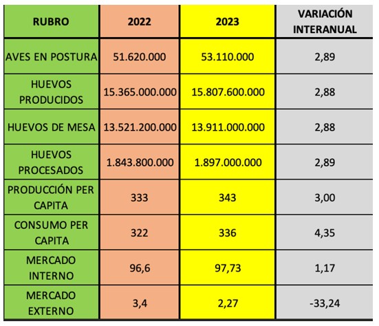 El rubro Huevos Producidos la variación fue de 2,88% con 15.807.600.000 mill. Y en Huevos de Mesa la cifra fue de 13.911.000.000 mill con 2,88% de variación respecto del 2022, mientras que en Huevos Procesados se produjeron 1.897.000.000 con un aumento de 2,89% respecto del año anterior.