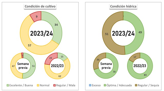 La condición hídrica Óptima/Adecuada disminuye a 49 % (semana previa 70%) producto de la combinación de dos factores: una alta demanda de agua por parte de los cultivos y del ambiente asociada a elevadas temperaturas. La evolución de las precipitaciones durante la próxima semana determinará el impacto de la falta de humedad sobre los lotes.