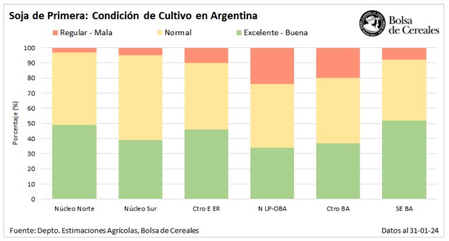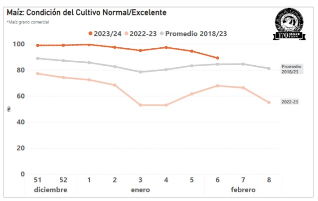 Por otro lado, si bien los cultivos en pie han visto afectada su condición, la caída hasta el momento no muestra igual magnitud que lo visto en la condición hídrica. Se estima que, a la fecha, el 89,3 % de los lotes reporta una condición entre Normal/Excelente, unos 5,2 p.p. por debajo de lo relevado la semana previa. Finalmente, se reporta una importante presencia de Dalbulus maidis (chicharrita vectora de Spiroplasma kunkelii) en el Centro-Norte de Santa Fe, Núcleo Norte y Entre Ríos.