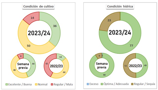 Las altas temperaturas provocan una caída de 15,4 p.p. en la condición hídrica Óptima/Adecuada, con los cultivos tempranos llenando grano y los cultivos tardíos entrando en su período crítico en el centro del área agrícola.
