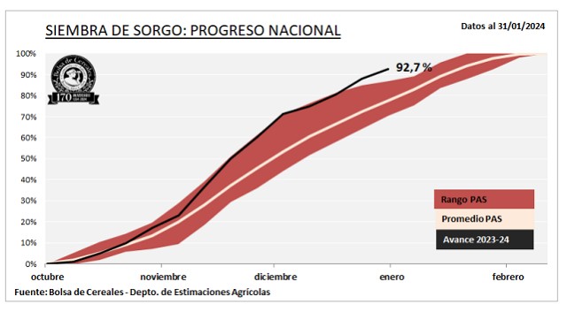 La siembra de sorgo granífero transita su recta final, restando por sembrarse lotes en el NOA y NEA. A la fecha, se estima que el 92,7 % de la superficie proyectada ya fue sembrada. Hacia el centro del país, la totalidad de los cultivos se encuentran en llenado de granos reportando una condición entre Normal y Buena. Sin embargo, especialmente en materiales susceptibles, la presión de pulgón amarillo comienza a generar mermas en la condición de los lotes con controles deficientes. Hacia el Centro-Norte de Santa Fe, que concentra el 19 % de la superficie nacional, la totalidad de los cuadros se define entre normal y buena.
