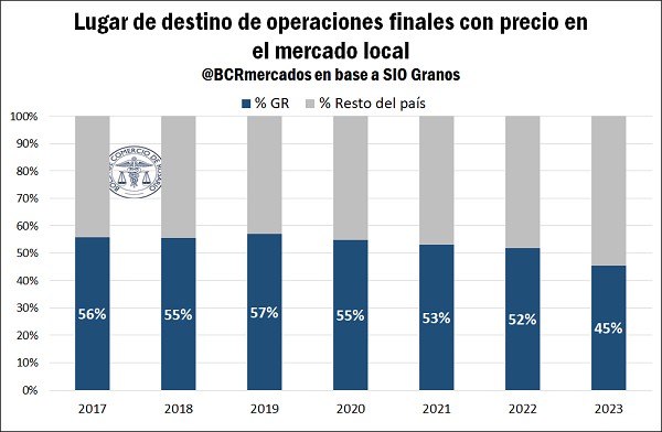 Finalmente, en cuanto al destino de la mercadería, el Gran Rosario es la zona de entrega por excelencia de la mercadería operada. En 2023, 45% de las operaciones realizadas tuvieron este destino declarado. A pesar de ello, la participación del Gran Rosario como destino del tonelaje operado fue el menor de los últimos años. Discriminando por producto, del total comercializado de maíz durante todo el 2023 el 43% tuvo como destino la región del Up River, en tanto que en soja su participación aumenta al 65%, y resulta del 33% para el trigo. La expectativa apunta a que, en 2024, de la mano de la recomposición de la producción en la zona central y norte del país, junto con la mayor profundidad del Río Paraná, el Up River recobre participación dentro de los destinos de venta de los granos.