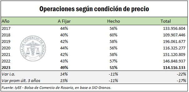 En la plataforma SIO Granos se informaron 114,16 Mt entre contratos y fijaciones finales, incluyendo diversos productos como el maíz, trigo, cebada, arroz, girasol, soja, sorgo. Entre éstas, se destaca el crecimiento de las operaciones a fijar en relación con aquellos contratos con precio hecho. En efecto, las primeras ascienden al 49% del total negociado, la mayor participación desde el inicio de la serie en 2017, y un 15% por encima del promedio de los últimos 3 años. Este resultado se fundamenta en la incertidumbre productiva, económica y política que signó la realidad agropecuaria del año 2023.