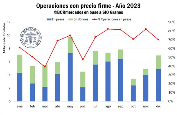 Respecto de la moneda de venta, sobre el total de 76,3 Mt registradas con precio firme, el 68% de las operaciones fueron con precio en pesos, aumentando su uso en un 67% si se lo compara con el promedio en los últimos 5 años.