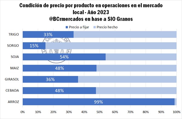 Discriminando por producto, en el caso de la soja el 54% de las operaciones fueron con precio a fijar, para cebada y maíz el 48%, girasol y trigo en torno al 30% y sorgo el 15%. Las toneladas comercializadas de arroz fueron casi por completo bajo precio a fijar.