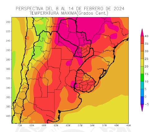 Al inicio de la primera etapa de la perspectiva los vientos del trópico continuarán dominando la mayor parte del Cono Sur, con un foco de calor extremo sobre el norte del área agrícola, y valores intensos, pero no extremos, sobre la mayor parte de su extensión, mientras solo las áreas cercanas al Litoral Atlántico observarán registros menos extremos debido a la entrada vientos marinos. La mayor parte del área agrícola argentina, el sudeste del Paraguay y gran parte del parea agrícola uruguaya observarán temperaturas máximas superiores a 35°C con varios focos con valores superiores a 40°C que se ubicará sobre gran parte del Paraguay, el norte de la Región del Chaco, el este de Salta, el norte de Corrientes, el nordeste de Santa Fe y el sudeste de Entre Ríos y otros focos con valores inferiores. El centro del NOA, el centro de Cuyo, la mayor parte de la Provincia de Buenos Aires y el centro-norte del Uruguay observará temperaturas máximas entre 30 y 35°C. El centro-oeste del NOA y el oeste de Cuyo observarán temperaturas máximas entre 25 y 30°C. El oeste del NOA experimentará máximas inferiores a 25°C, con focos con valores inferiores.